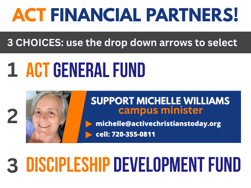You may also donate by check. Simply make checks out to Active Christians Today (please let us know which account is your preference on a sticky note) and mail to: ACT PO Box 1408 Bowling Green, OH 43402.